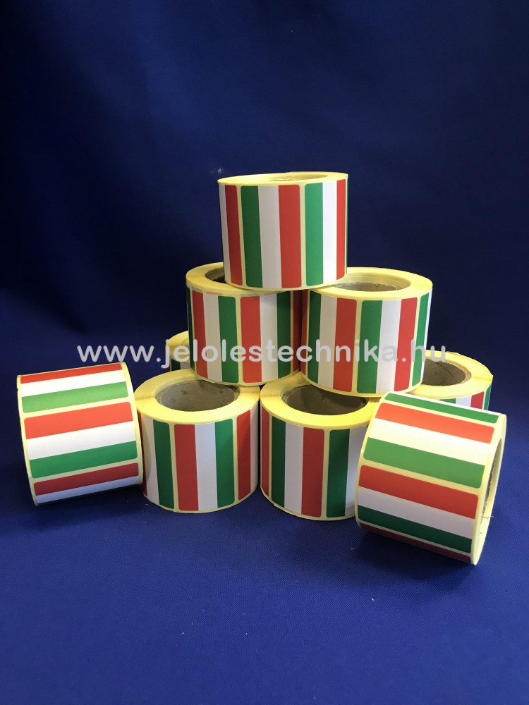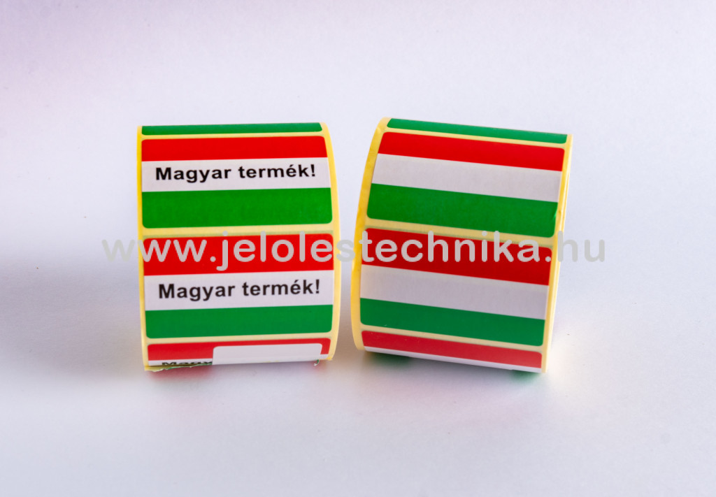 Prémium minőségű, előrenyomott vellum öntapadó címke magyar zászló grafikával. Ideális választás magyar termékek megjelölésére, bolti és logisztikai felhasználásra.
